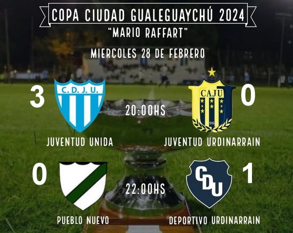 En la noche de este miercoles 28, En el Estadio Municipal se disputaron los encuentros correspondientes a los clasificatorios de la Copa Gualeguaychú. A primera hora, Juventud Unida le ganó por 3 a 0 a Juventud Urdinarrain con goles de Valentin Corbalan, Aryan Benitez y Nicolas Trejo. Finalizando la jornada, Deportivo Urdinarrain le ganó con gol de Dylan Larrea a Pueblo Nuevo.