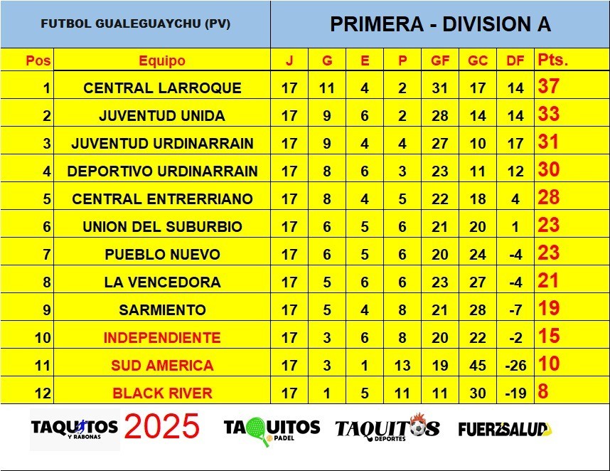 CANCHA CENTRAL LARROQUE. 13:00hs SUB21 Central Larroque vs Independiente. 15:15hs 1RA Central Larroque vs Independiente ESTADIO MUNICIPAL. 13:00hs SUB21 La Vencedora vs Juventud Urdinarrain. 15:15hs 1RA La Vencedora vs Juventud Urdinarrain. CANCHA DEPORTIVO URDINARRAIN. 13:00hs SUB21 Deportivo Urdinarrain vs Unión del Suburbio. 15:15hs 1RA Deportivo Urdinarrain vs Unión del Suburbio. CANCHA CERRO PORTEÑO. 13:00hs SUB21 Black River vs Central Entrerriano. 15:15hs 1RA Black River vs Central Entrerriano.