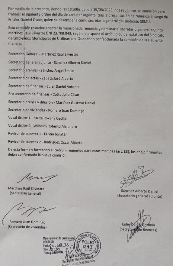 A las 18:30hs del día 19/08/2025, se reúne la comisión para trabajar el siguiente orden del día de carácter urgente, tras la presentación de renuncia al cargo de <b> Fritzler Gabriel Oscar </b>, quien se desempeña como secretario general del sindicato SEMU (Sindicato de Empleados Municipales Urdinarrain).