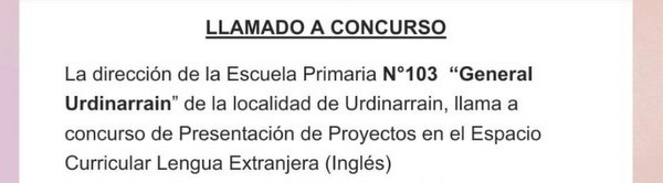 La dirección de la Escuela Primaria N°103  “General Urdinarrain” de la localidad de Urdinarrain, llama a concurso de Presentación de Proyectos en el Espacio Curricular Lengua Extranjera (Inglés) - Según Resoluciones: 1785/18 CGE,  355/12 CGE,  1000/17 CGE 1335/18 CGE, 300/12 CGE, 5010/18 CGE en el marco del Proyecto de Jornada Extendida para 6º grado.