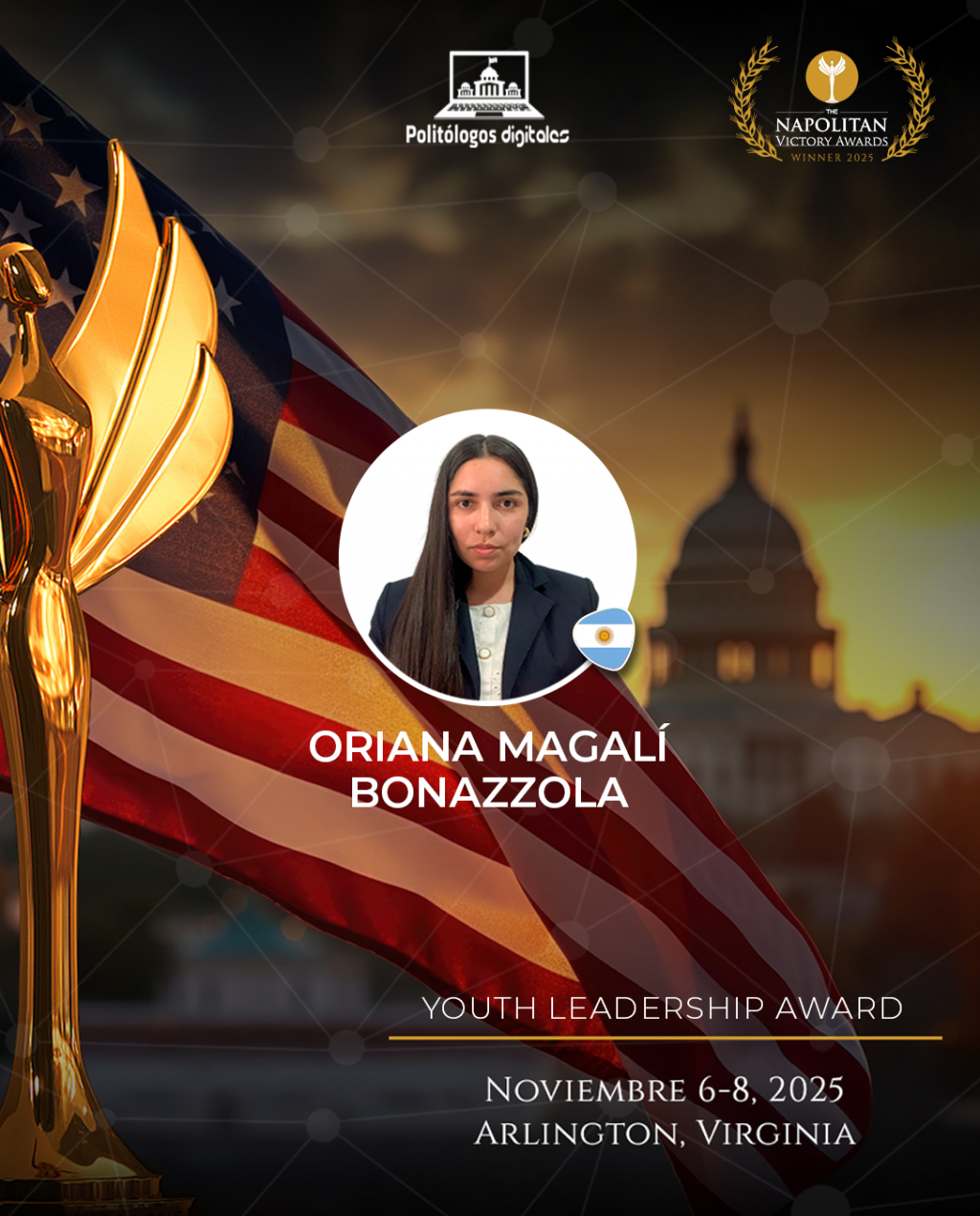 Oriana Bonazzola, consultora política y politóloga oriunda de Urdinarrain, Entre Ríos, fue reconocida con el Napolitan Victory Award en la categoría “Líderes Emergentes / Youth Leadership Award”, distinción que la ubica entre los jóvenes profesionales más destacados del mundo en el campo de la comunicación política.
