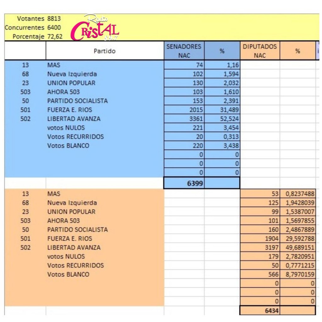 EN URDINARRAIN SENADORES:. LA LIBERTAD AVANZA: 3361 ( 52.52%) - FUERZA E.RIOS: 2015 ( 31.48%) - 1346 VOTOS - - - DIPUTADOS: LLA 3.197 ( 49.68%) FER 1904 ( 29.59% ) - - 1.293 votos -
