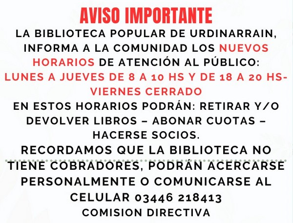 Biblioteca Popular Urdinarrain Nuevos horarios