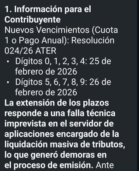 Desde la provincia se informa que ATER de acuerdo a la Resolución 24/26 extiende las fechas de VENCIMIENTOS de los Impuestos Inmobiliario Urbano de acuerdo la terminación de digitos, ya sea para pago en cuota o anual.