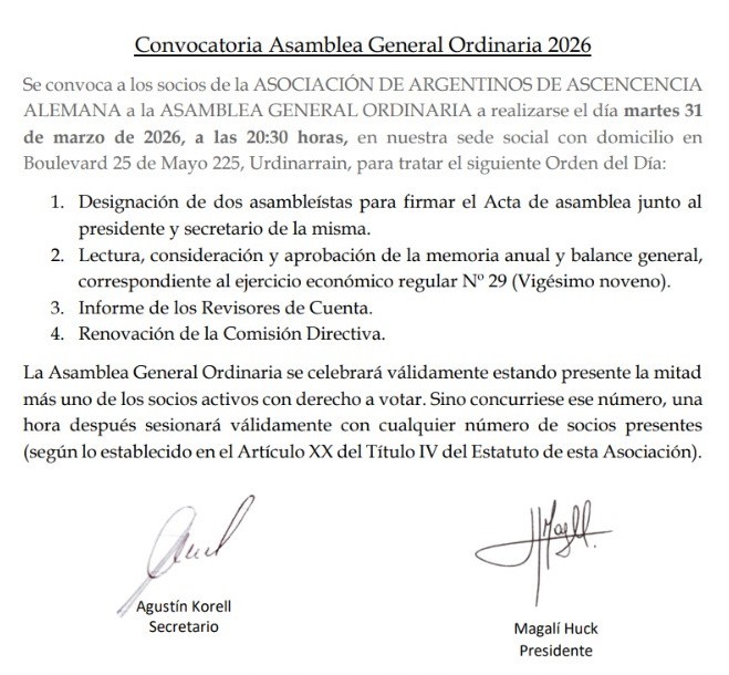 Se convoca a los socios de la ASOCIACIÓN DE ARGENTINOS DE ASCENCENCIA ALEMANA a la ASAMBLEA GENERAL ORDINARIA a realizarse el día martes 31 de marzo de 2026, a las 20:30 horas, en nuestra sede social con domicilio en Boulevard 25 de Mayo 225, Urdinarrain, para tratar el siguiente Orden del Día: