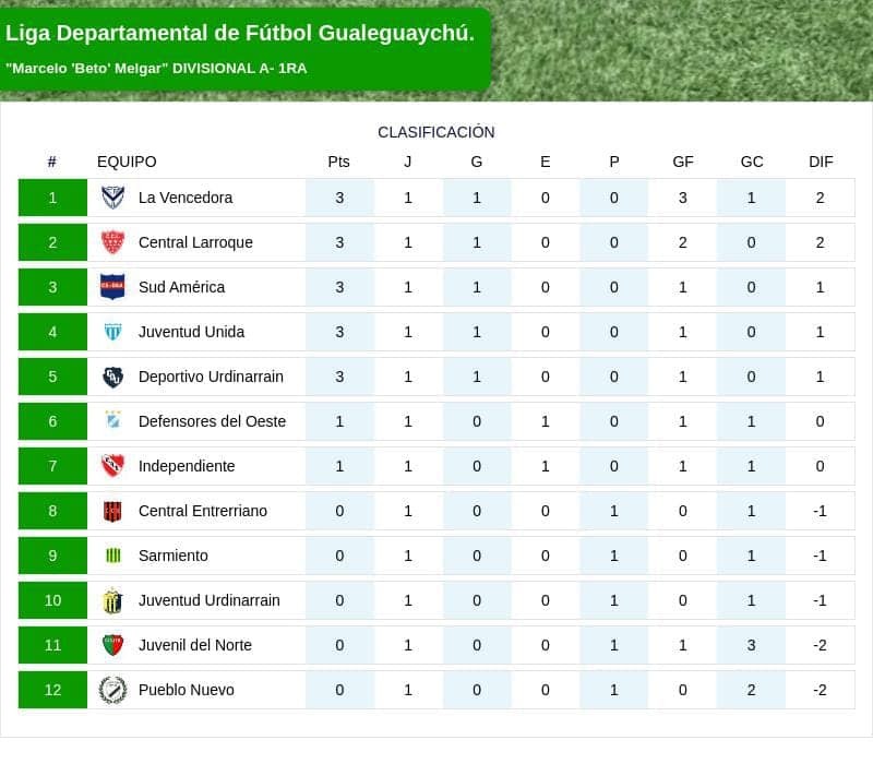 Finalizó la primera fecha del Torneo Oficial “Marcelo 'Beto' Melgar"- Divisional A, que organiza la Liga Dptal de Fútbol de Gchu. En la primer fecha ganaron La Vencedora, Central Larroque, Juventud Unida, Sud América y Deportivo Urdinarrain. La Próxima fecha se estará disputando entre sábado y Domingo Próximo