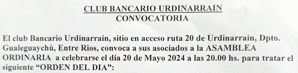 Lunes 20 de mayo a las 20 hs, el Club Bancario Urdinarrain llevará a cabo su Asamblea General Ordinaria para la renovación de la comisión directiva además de otros puntos del orden del dia
