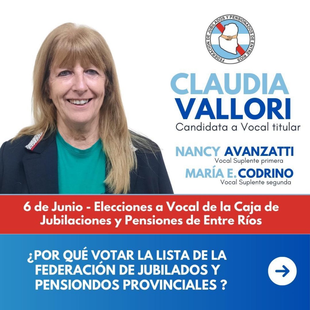 Este 6 de Junio en la elecciones a vocal de la Caja de Jubilaciones y Pensiones de Entre Rios, la Federación de Jubilados y Pensionados lleva como candidata a Claudia Vallori. Por primera vez se votará con Boleta única