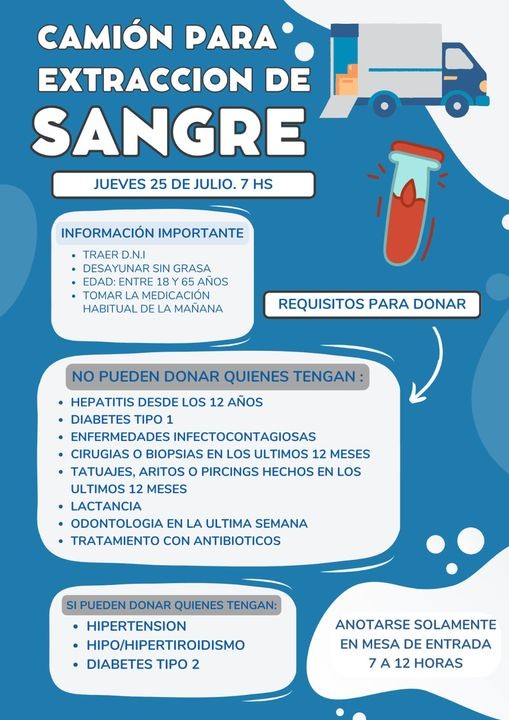 Desde las 7 hs del Jueves 25 todos los que deseen donar sangre en Gilbert lo podrán hacer en el Hospital de la mencionada localidad. Para tal fin llegará el camión para extracción de sangre.