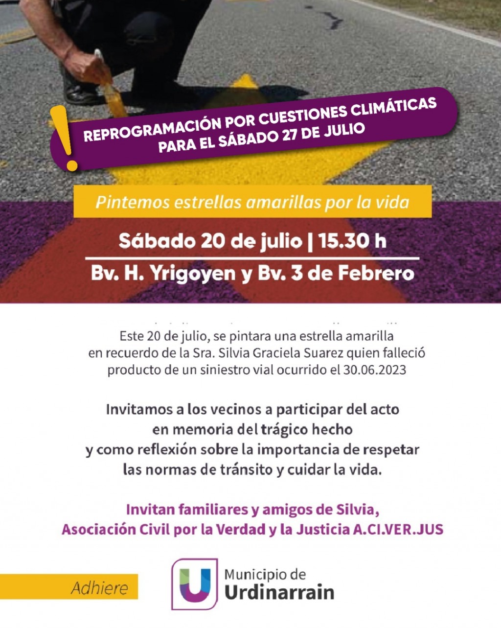 Este sábado 27 de julio (reprogramada) se pintará una estrella amarilla por la Sra. Silvia Graciela Suarez, quien perdió la vida producto de un accidente de tránsito ocurrido el 30 de junio de 2023.