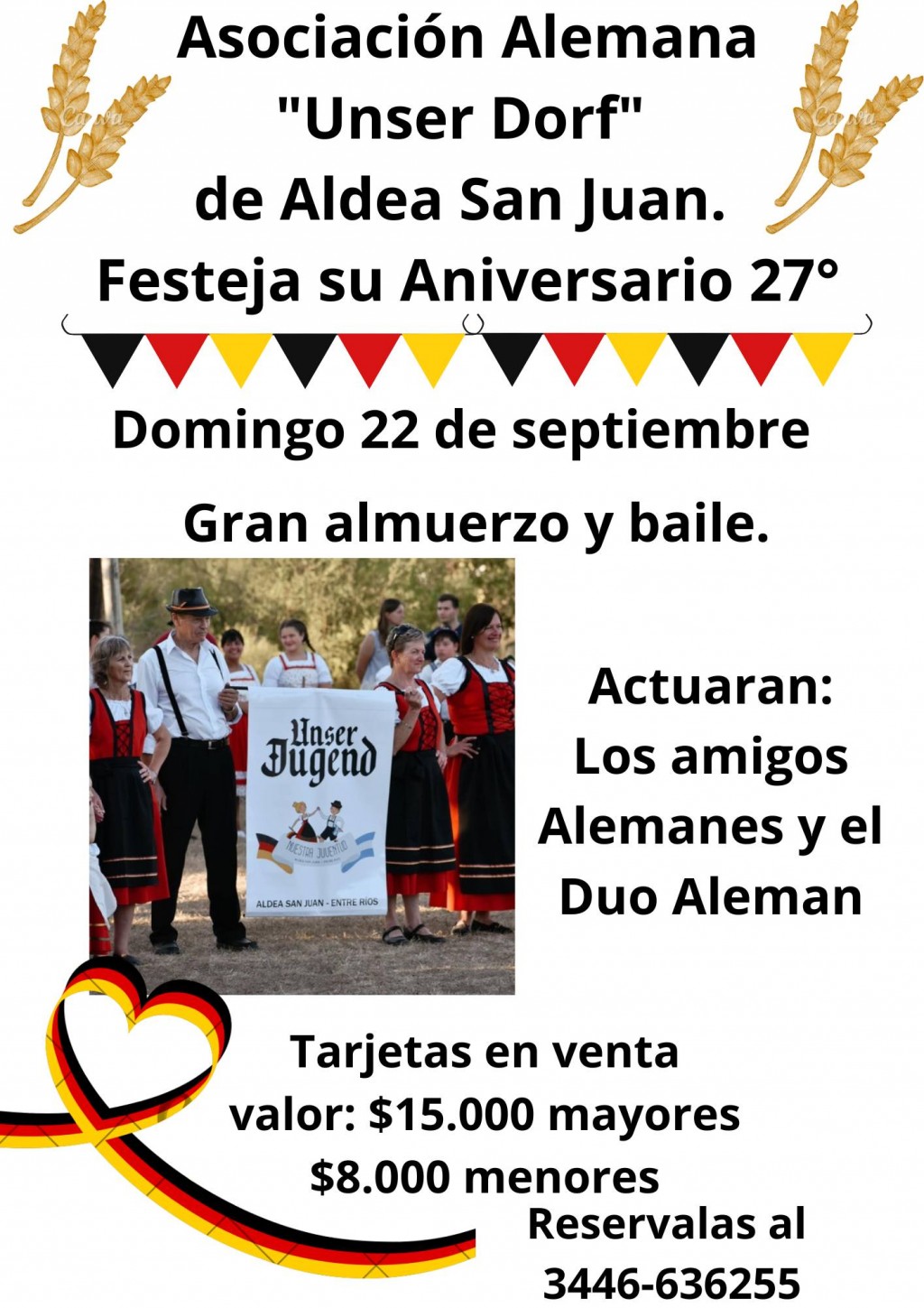 Este Domingo 22, Aldea San Juan está de Fiesta, por los 27 años de vida de La Asociación Alemana "Unser Dorf" de la mencionada localidad.