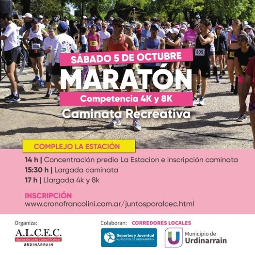 Este sábado 5 de Octubre, se llevará a cabo la anunciada Maratón de ALCEC, con partida en La Estación. Son 4k, 8K y Caminata recreativa. El evento es controlado por Cronometraje Francolini, y los horarios de largada son los siguientes: