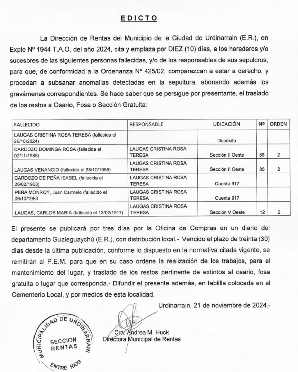 La Dirección de Rentas del Municipio de la ciudad de Urdinarrain (E.R.) en Expte. Nº 1944 T.A.O. del año 2024, cita y emplaza por DIEZ (10) dias alos herederos y/o sucesores de las siguientes personas fallecidas, y/o responsables de sus sepulcros, para que, de conformidad a la Ordenanza Nº 428/02, comparezcan a estar a derecho, y procedan a subsanar.....