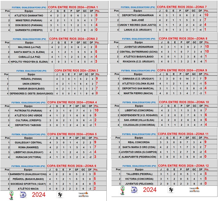 Este Fin de Semana se jugó la 4ta fecha de la Copa Entre Rios. Deportivo empató en cero el sábado por la noche en C. del Uruguay ante Lanus. Mientras que el Domingo, Juventud, despachó a Rivadavia, también de la histórica por 1 a 0 con tanto de Burgos a los 12 del segundo Tiempo. También Ganaron Sarmiento de Gchú en Maciá ante Atlético por 3 a 1 y Central Entrerriano hizo lo propio en Basavilbaso ante Atlético por 2 a 1. Cabe acotar que quedaron dos partidos postergados para este martes 13, por las inclemencias del tiempo