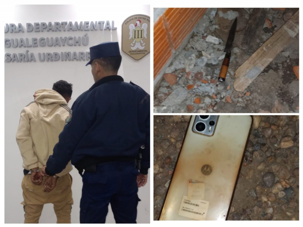 Para lo cual concurren los móvil 501 y 685 a Bv. 12 de Octubre.  Al  inspeccionar la zona y luego de entrevistar a la damnificada se realiza un rastrillaje y se lo observa al hombre en un galpón abierto, a una cuadra de la casa de la víctima Caseros y Bv. 12 de Octubre, quien al notar la presencia policial se descarta de un cuchillo, pero igualmente se lo logra aprehender en el lugar.