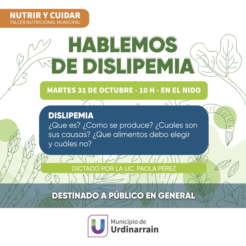 Organizado por el Municipio, a través de la dirección de Desarrollo Social, el próximo martes 31 de octubre a las 10 h, se desarrollará en el NIDO un nuevo encuentro en el que se hablará sobre “Dislipemia - ¿Qué es? ¿Cómo se produce? ¿Cuáles son las causas? ¿Qué alimentos debo elegir y cuáles no?
