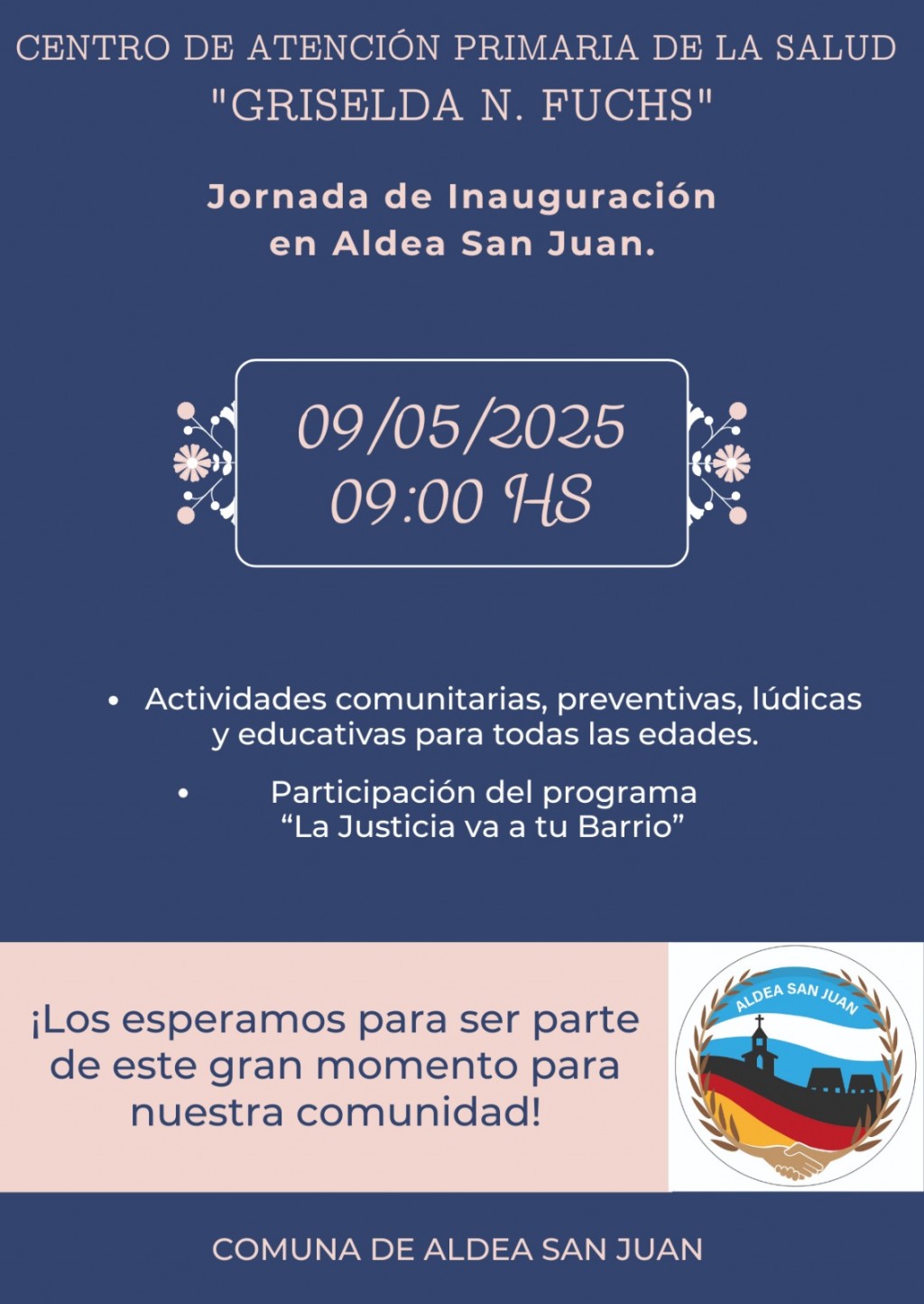 Tenemos el agrado de invitar a la comunidad a participar de la Jornada de Inauguración del Centro de Atención Primaria de la Salud “Griselda N. Fuchs”, que tendrá lugar el día 9 de Mayo a las 9:00 hs en nuestra localidad, Aldea San Juan. Este nuevo espacio representa un avance fundamental en el fortalecimiento del sistema de salud local, con una mirada integral que articula atención comunitaria, prevención, contención psicosocial y trabajo interinstitucional. La jornada contará con la participación de profesionales de distintas áreas, instituciones educativas, religiosas, fuerzas de seguridad y comunidad en general. Contaremos también con la presencia del programa “La Justicia va a tu Barrio”, brindando servicios Junto al registro civil Registro Civil de la localidad de Urdinarrain y orientación en el acceso a derechos. Será un honor recibir su presencia y contar con su acompañamiento en este acto tan significativo para nuestra comunidad, en el que también rendiremos homenaje a quien da nombre al centro de salud, Griselda N. Fuchs. Agradecemos su compromiso, saluda atentamente Nelson D. Treise - Presidente Comunal