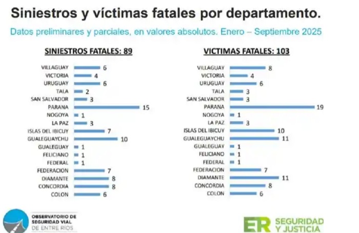 La distribución geográfica de los hechos mortales muestra que Paraná fue el departamento más afectado, con 15 siniestros fatales y 19 víctimas. Le siguen Gualeguaychú y Diamante, con 11 fallecidos cada uno. En contraste, los departamentos Federal, Feliciano, Gualeguay y Nogoyá fueron los que menos muertes registraron, con una víctima cada uno.