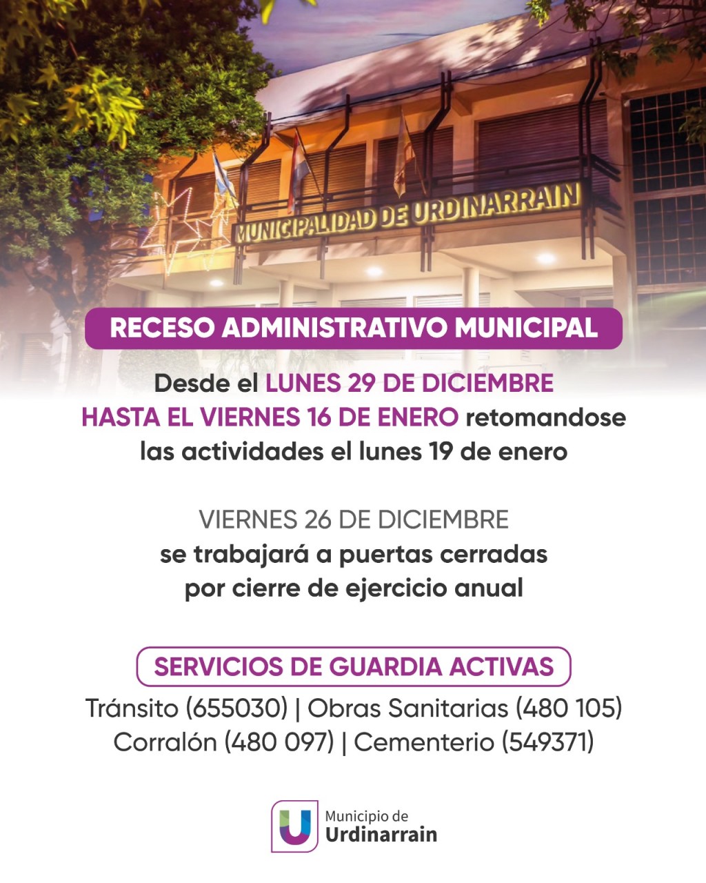El Municipio informa que, con motivo del receso administrativo, permanecerá cerrado desde el lunes 29 de diciembre hasta el viernes 16 de enero inclusive.