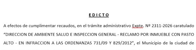 A efectos de cumplimentar recaudos, en el trámite administrativo Expte. Nº 2311-2026 caratulado “DIRECCION DE AMBIENTE SALUD E INSPECCION GENERAL - RECLAMO POR INMUEBLE CON PASTO ALTO - EN INFRACCION A LAS ORDENANZAS 731/09 Y 829/2012”, el Municipio de la ciudad de Urdinarrain (E.R.), cita y emplaza por cinco (5) días al señor PEREYRA FRANCISCO, sus sucesores y/o herederos y/o quienes se consideren con derechos sobre el inmueble ubicado en calle Bvar. San Martin 467, de la ciudad de Urdinarrain (Entre Ríos), Partida Provincial Nº 159151, que se encuentra con yuyales y malezas en exceso entre otros, configurando un ámbito que facilita el desarrollo de roedores e insectos, siendo además molesto para el vecindario, ello en contravención ó infracción al Art. 1º de la Ordenanza Nº 731/09, para que proceda a la limpieza del mismo, bajo formal apercibimiento de hacerlo a su exclusivo costo y cargo -sin perjuicio de la aplicación de las multas que establecen las Ordenanzas Municipales vigentes citadas y proceder al cobro por la vía de apremio fiscal. La presente implica además emplazamiento, para que efectúe el correspondiente descargo y ofrezca la prueba que hagan a su derecho -art. 45º del Código Municipal de Faltas.- Publíquese por un (1) día. Urdinarrain, 28 de Noviembre de 2025. (Fdo. Mg. Pierina A. Rodriguez Dirección de Ambiente Salud e Inspección General).-----------------------------------