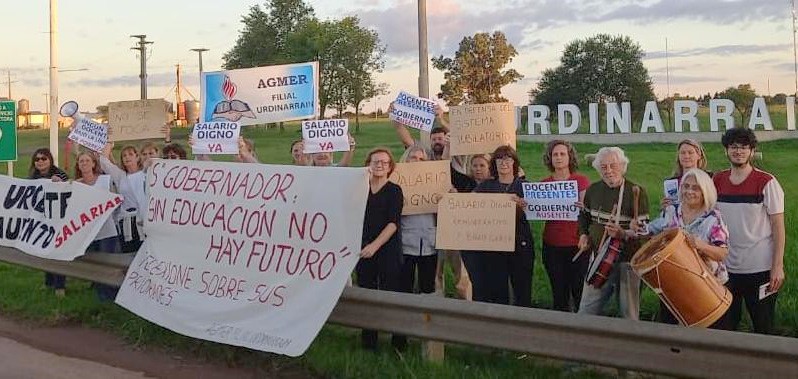 En el marco de una jornada de protesta que se replicó en distintos puntos de la provincia, este jueves 16 de abril a las 17:30 horas, un grupo de docentes de Urdinarrain se concentró en la rotonda de acceso norte a la ciudad, donde estuvieron acompañados de publico en general, apoyando esta manifestación