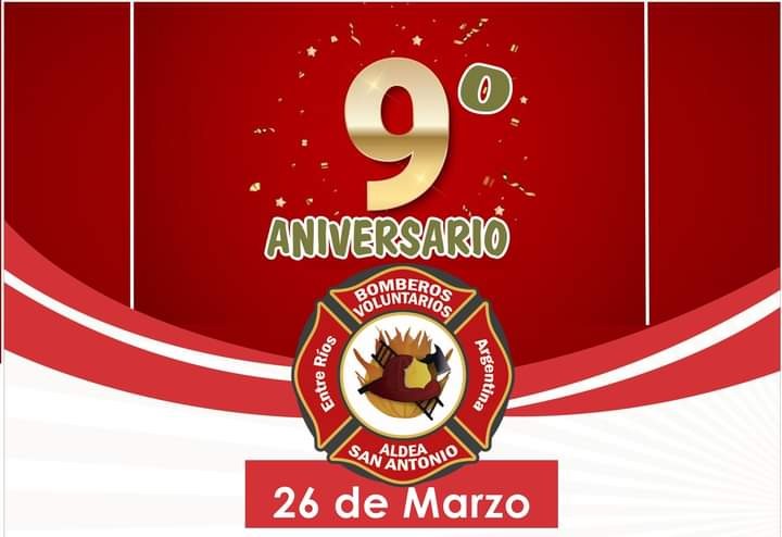 9° Aniversario de La Asociación Civil de Bomberos Voluntarios de Aldea San Antonio. - 2015 - 2024 - "En este Nuevo Aniversario, la Comisión y Cuerpo Activo de Bomberos Voluntarios de Aldea San Antonio hace extensivo el saludo y agradecimiento a toda la comunidad por acompañar y apoyar el crecimiento y desarrollo de nuestra institución." Saludamos especialmente a quienes han participado en la institución desde aquel 26 de marzo de 2.015.