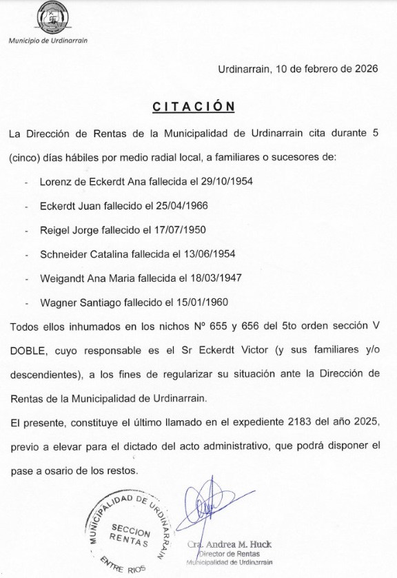 La Dirección de Rentas de la Municipalidad de Urdinarrain, cita durante 5 (cinco) días hábiles por medio radial local, a familiares o sucesores de:
